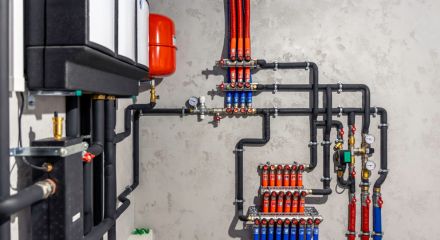 Complete sanitaire installatie en leidingwerk voor een moderne badkamer.